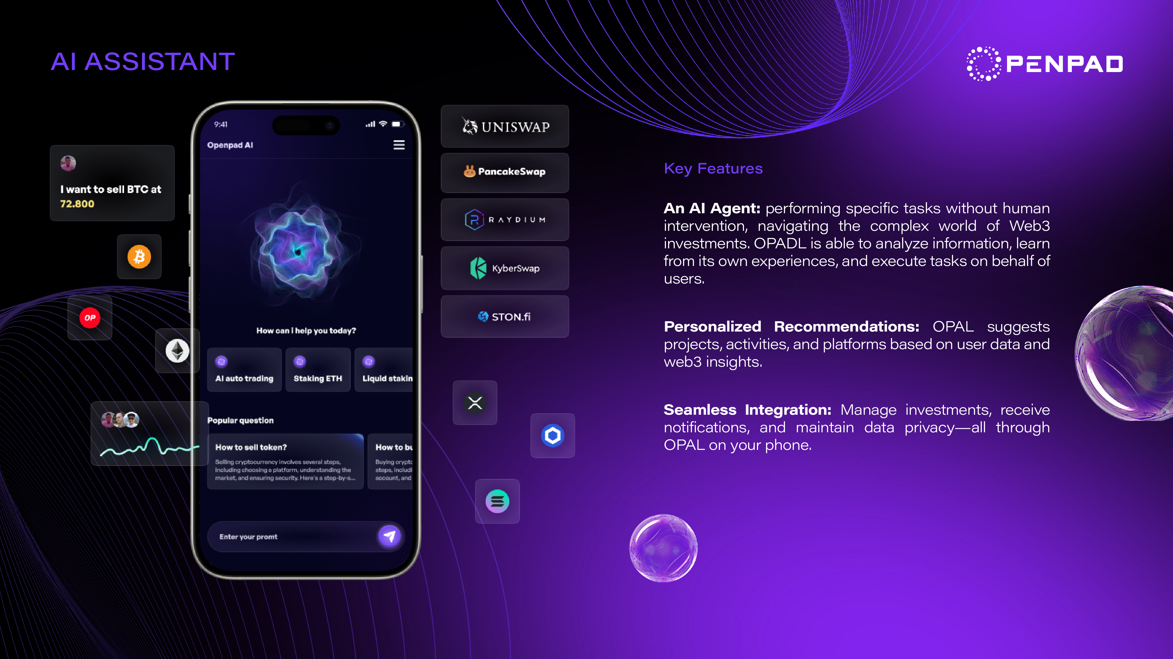 The AI Assistant of OPAD ecosystem is called OPAL, an AI Agent, that performs specific tasks without human intervention. You can easily interact with OPAL **here**, and enjoy engaging conversations with this intelligent assistant. OPAL is also designed to help users navigate the OpenPad ecosystem, and explore and manage web3 investment opportunities. OPAL is rapidly evolving, with many exciting new features waiting for you to explore and unlock!
